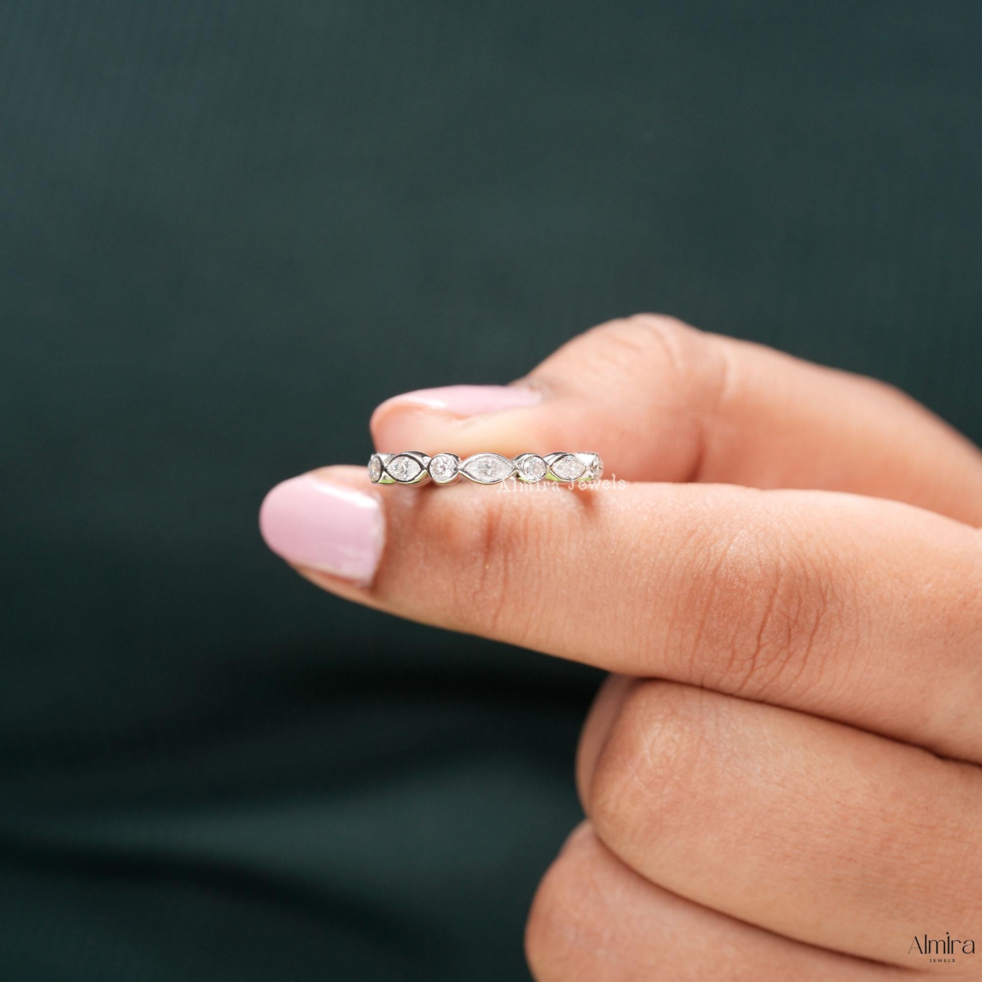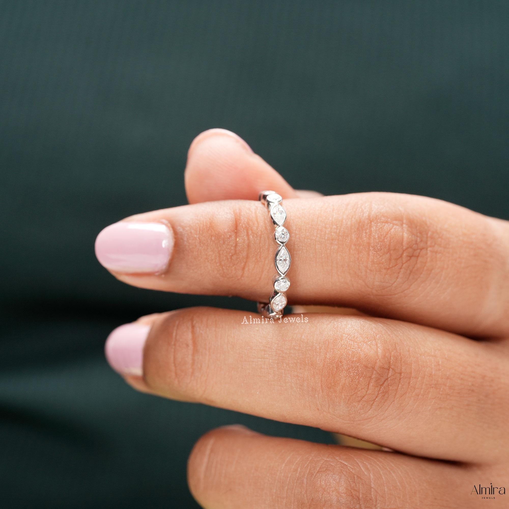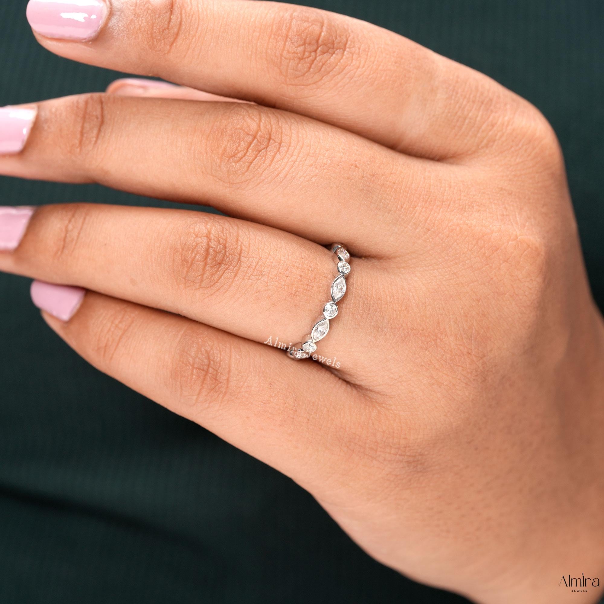 Alternative Marquise and Round Cut Bezel Set Moissanite Wedding Band, Full Eternity Minimalist Diamond Band, Stacking Anniversary Gift Band