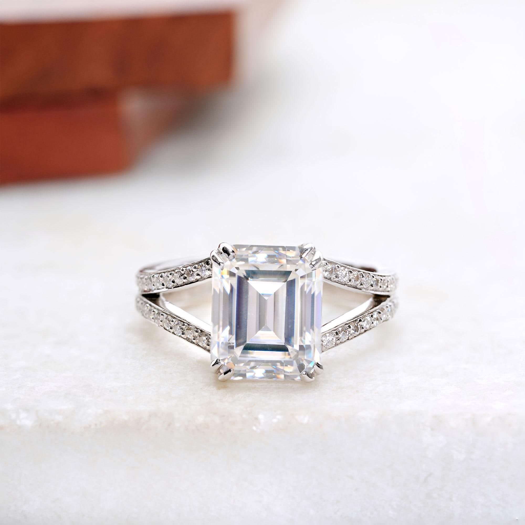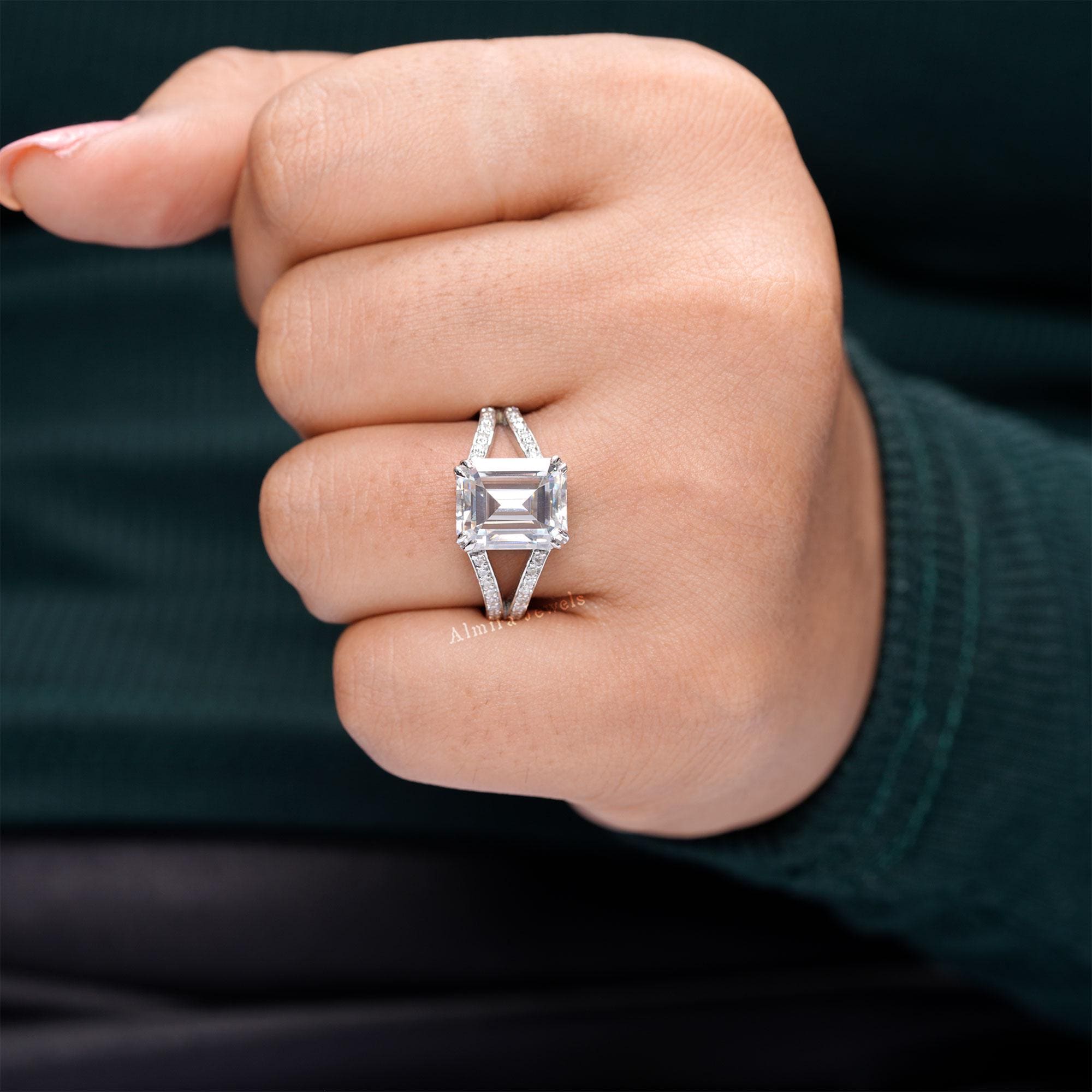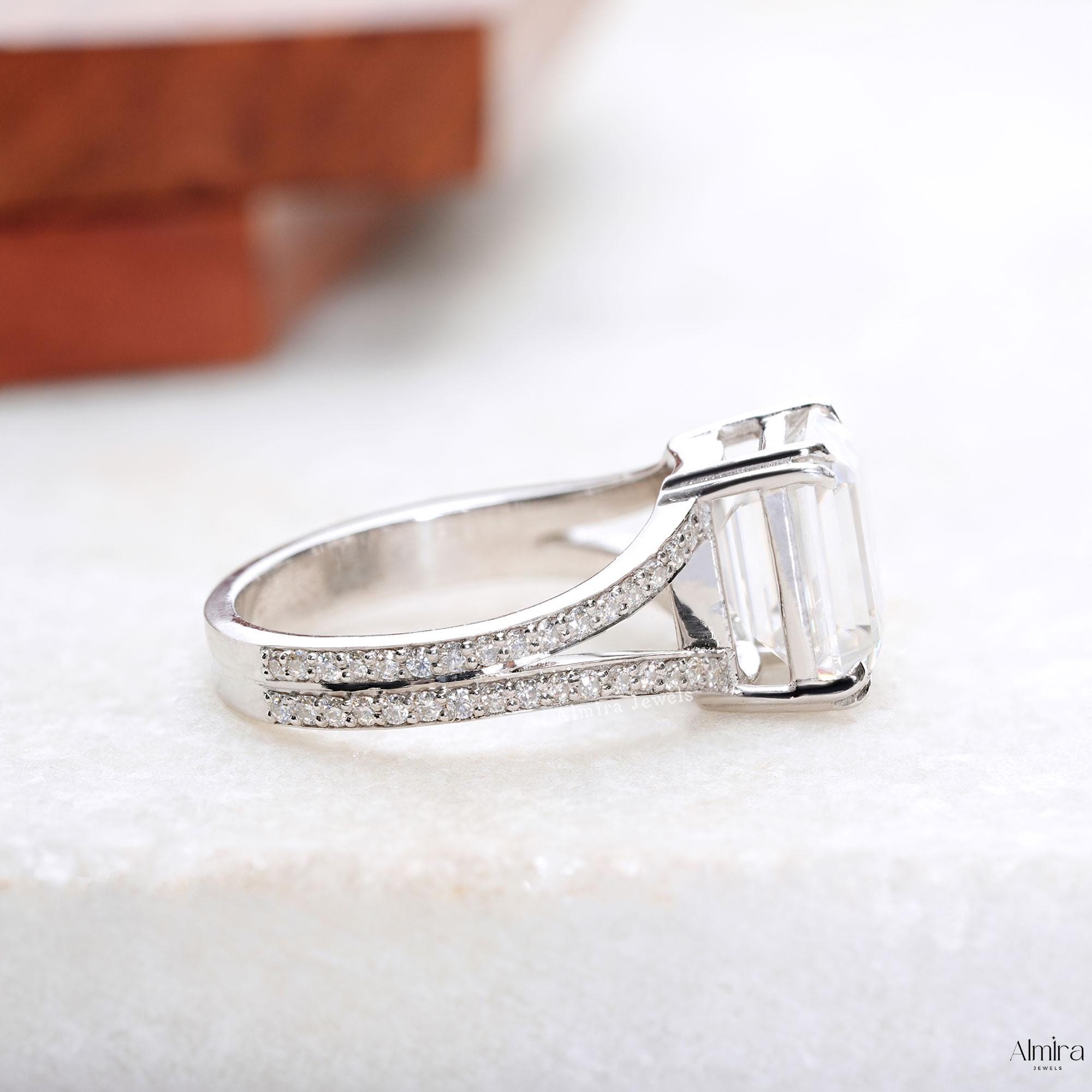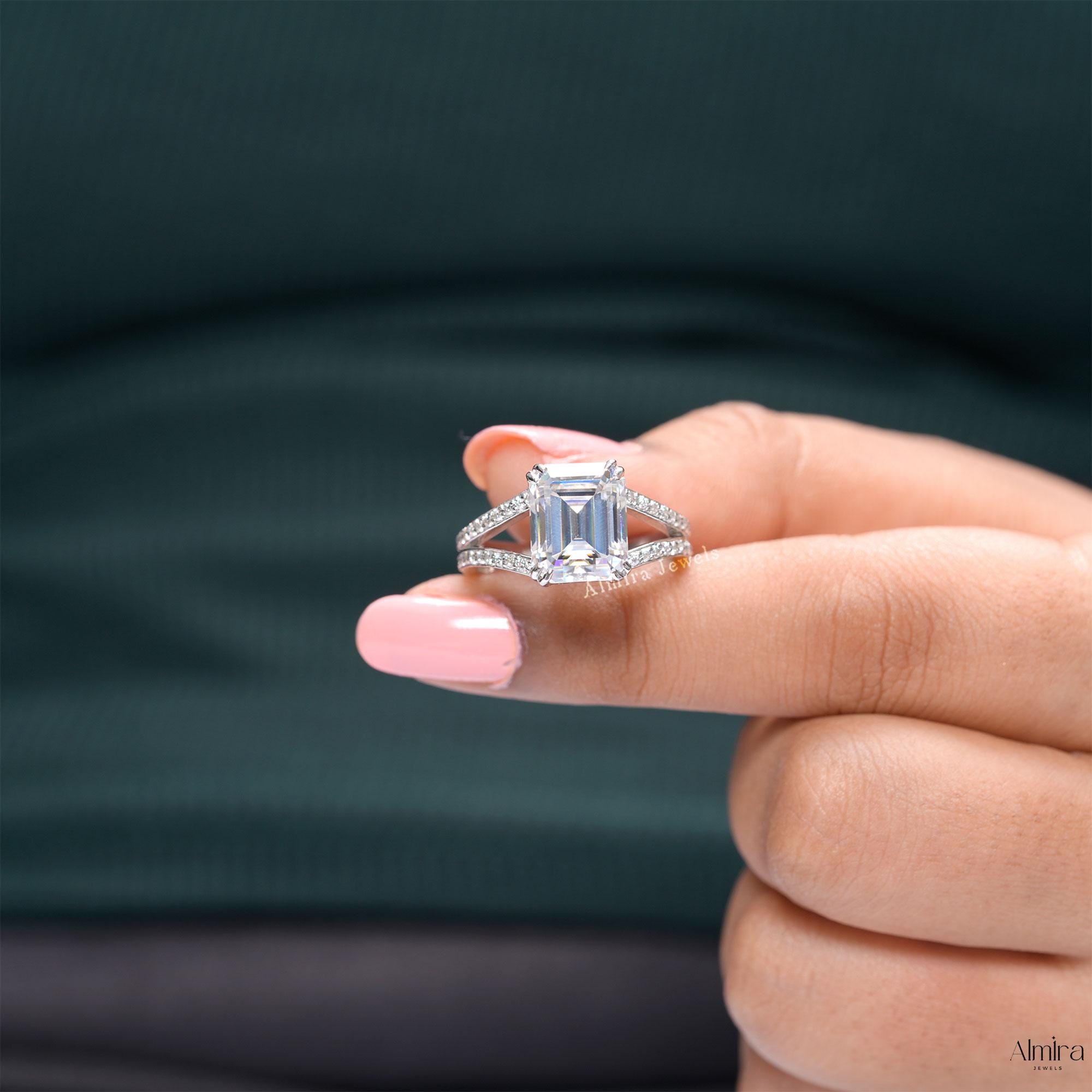 Emerald Moissanite Split Shank Engagement Ring, Solid White Gold Double Prong Promise Ring, 2.50 CT Emerald Moissanite Wedding Ring For Her