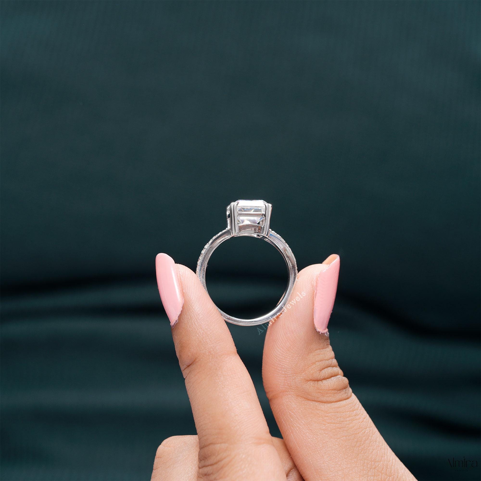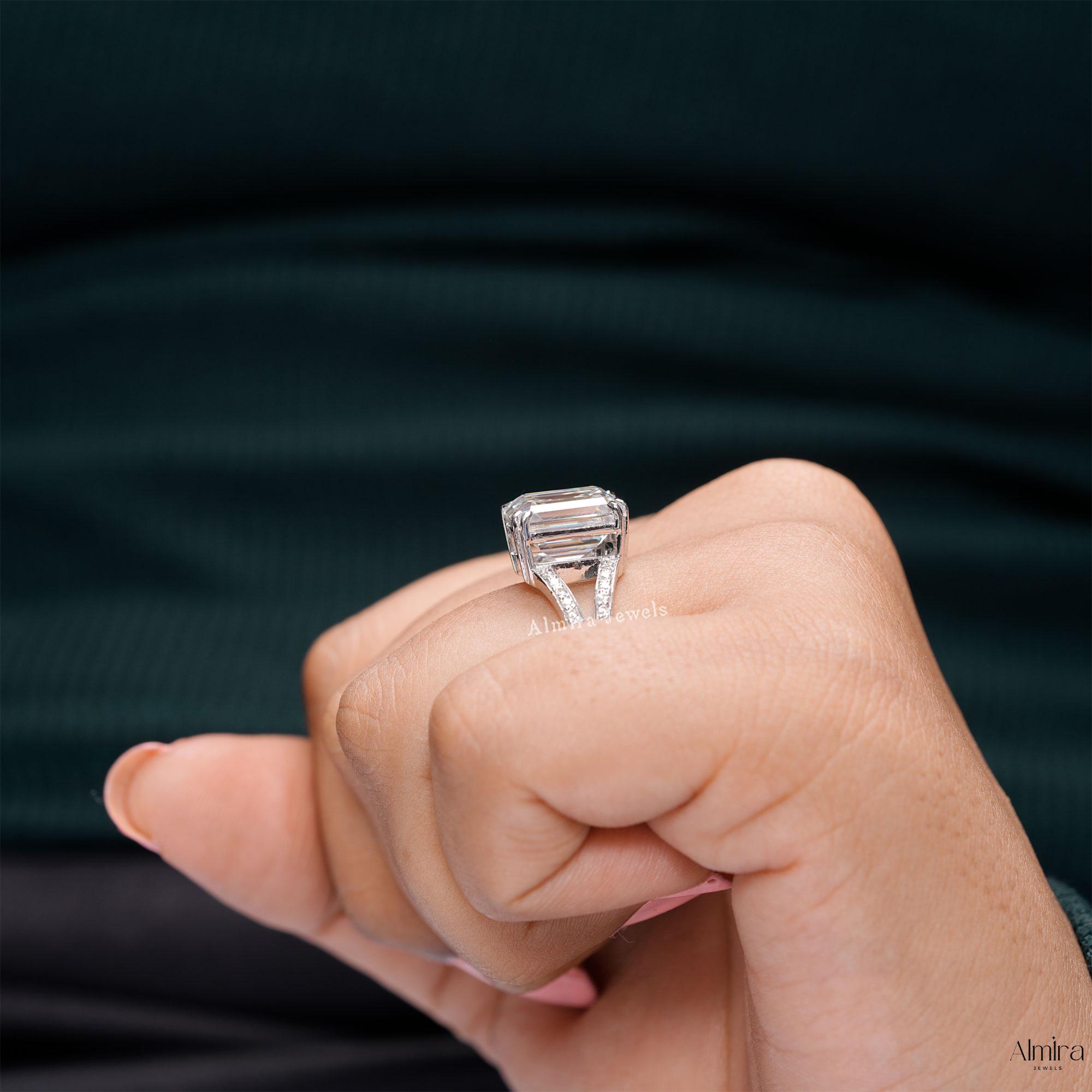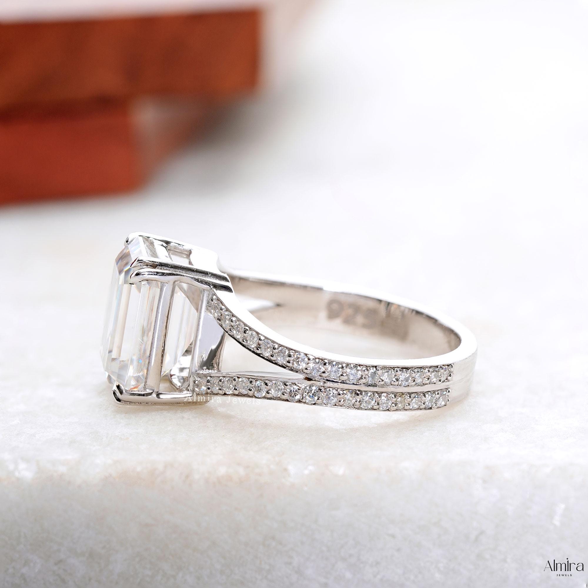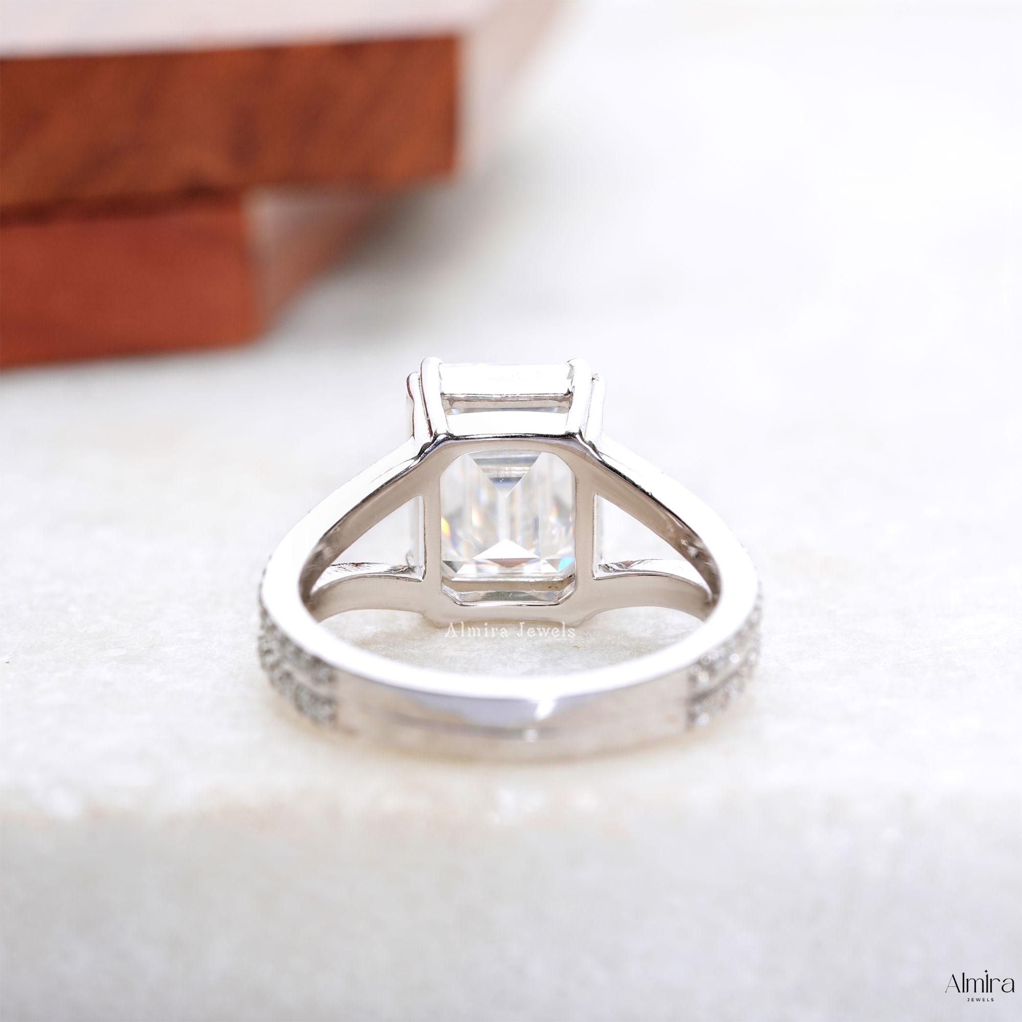 Emerald Moissanite Split Shank Engagement Ring, Solid White Gold Double Prong Promise Ring, 2.50 CT Emerald Moissanite Wedding Ring For Her